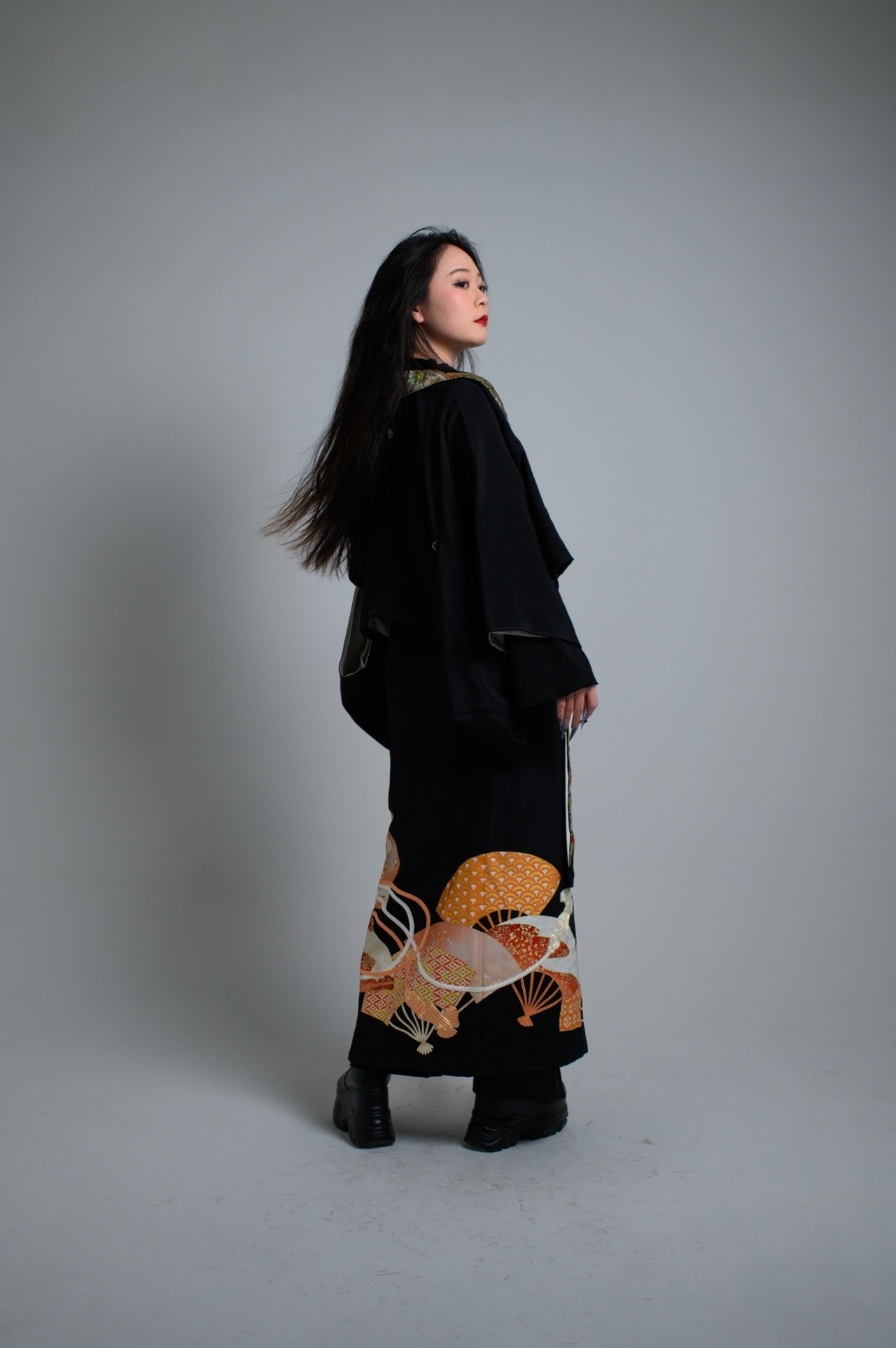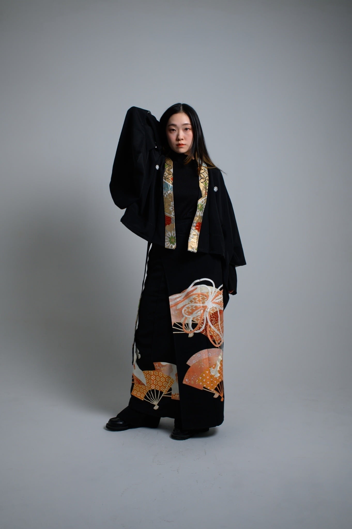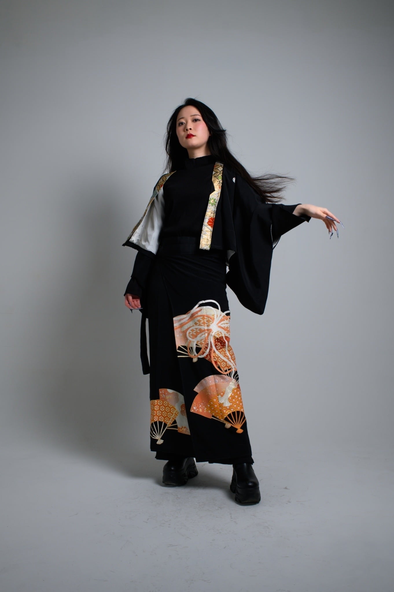 刺繍の柄が映える巻きスカートに襟に帯の生地でよりラグジュアリーさを演出